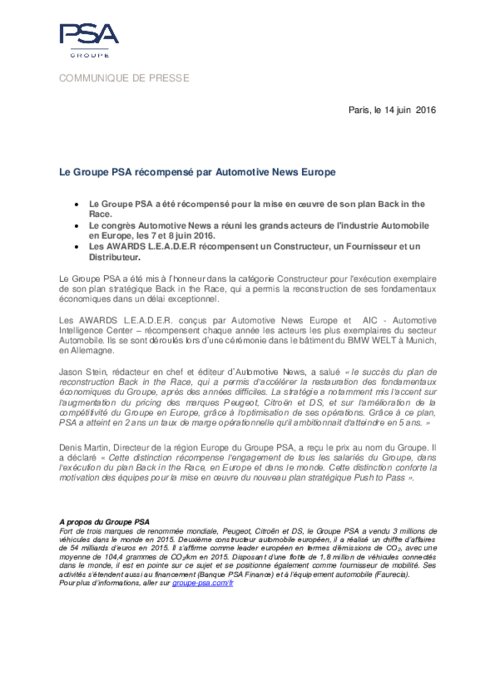 Le Groupe PSA a été mis à l’honneur dans la catégorie Constructeur pour l'exécution exemplaire de son plan stratégique Back in the Race, qui a permis la reconstruction de ses fondamentaux économiques dans un délai exceptionnel. Les AWARDS L.E.A.D.E.R. conçus par Automotive News Europe et AIC - Automotive Intelligence Center – récompensent chaque année les acteurs les plus exemplaires du secteur Automobile.