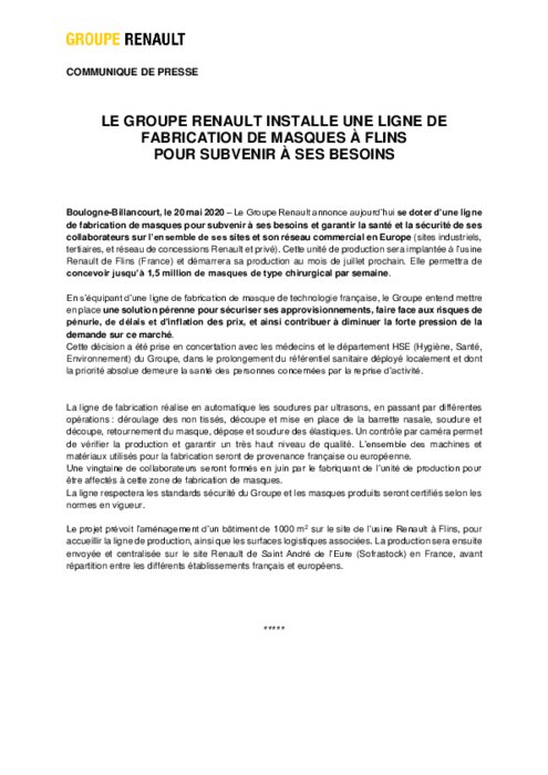 Le Groupe Renault annonce se doter d’une ligne de fabrication de masques pour subvenir à ses besoins et garantir la santé et la sécurité de ses collaborateurs sur l’ensemble de ses sites et son réseau commercial en Europe (sites industriels, tertiaires, et réseau de concessions Renault et privé). Cette unité de production sera implantée à l’usine Renault de Flins (France) et démarrera sa production au mois de juillet prochain. Elle permettra de concevoir jusqu’à 1,5 million de masques...
