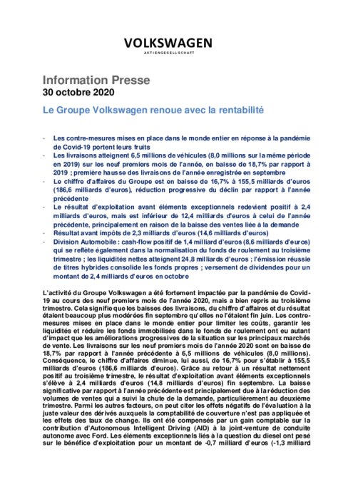 Les livraisons sur les neuf premiers mois de l’année 2020 sont en baisse de 18,7% par rapport à l’année précédente à 6,5 millions de véhicules (8,0 millions). Conséquence, le chiffre d’affaires diminue, lui aussi, de 16,7% pour s’établir à 155,5 milliards d’euros (186,6 milliards d’euros). Grâce au retour à un résultat nettement positif au troisième trimestre, le résultat d’exploitation avant éléments exceptionnels s’élève à 2,4 milliards d’euros (14,8 milliards d’euros) fin septembre....