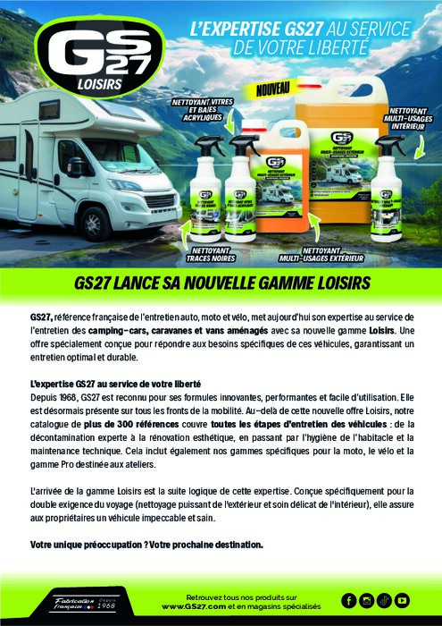 GS27, référence française de l’entretien auto, moto et vélo,met aujourd’hui son expertise au service de l’entretien des camping-cars, caravanes et vans aménagés avec sa nouvelle gamme Loisirs. Une offre spécialement conçue pour répondre aux besoins spécifiques de ces véhicules, garantissant un entretien optimal et durable.