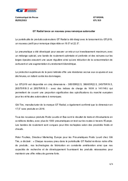 Le portefeuille de produits autoroutiers GT Radial a été élargi avec le lancement du GTL919, un nouveau profil pour remorque disponible en 19.5" et 22.5". Le pneumatique a été développé pour assurer un retour sur investissement maximum, avec un mélange spécial, une bande de roulement optimisée et profonde et des rainures sur les larges épaules assurant une usure régulière ainsi qu’une réduction de la consommation de carburant et une augmentation du rendement kilométrique.