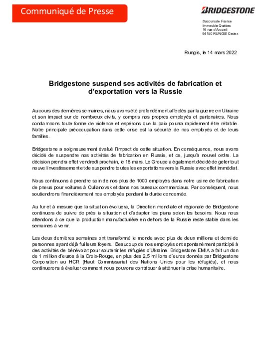 Bridgestone a soigneusement évalué l’impact de cette situation. En conséquence, nous avons décidé de suspendre nos activités de fabrication en Russie, et ce, jusqu’à nouvel ordre. La
