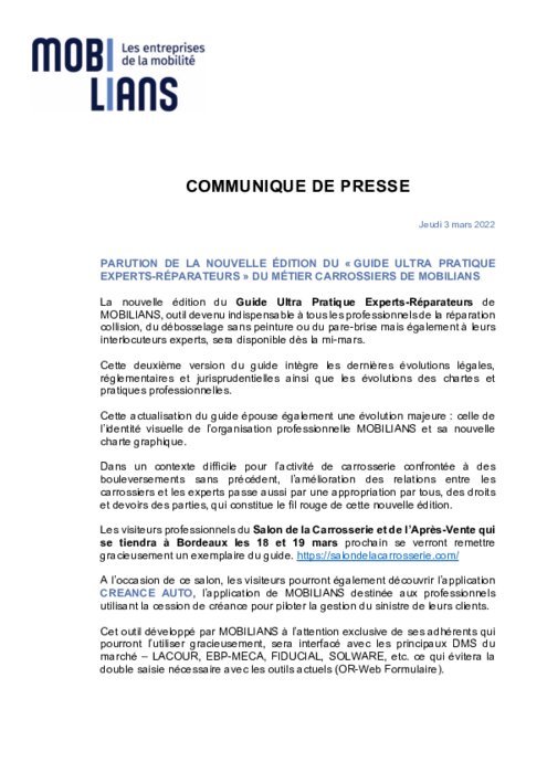 La nouvelle édition du Guide Ultra Pratique Experts-Réparateurs de MOBILIANS, outil devenu indispensable à tous les professionnels de la réparation collision, du débosselage sans peinture ou du pare-brise mais également à leurs interlocuteurs experts, sera disponible dès la mi-mars. Cette deuxième version du guide intègre les dernières évolutions légales, réglementaires et jurisprudentielles ainsi que les évolutions des chartes et pratiques professionnelles...