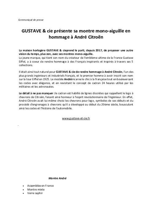 La maison horlogère GUSTAVE & cie prend le parti, depuis 2017, de proposer une autre vision du temps, plus zen, avec ses montres mono-aiguille. Il était ainsi tout naturel pour GUSTAVE & cie de rendre hommage à André Citroën, l'un des plus grands ingénieurs et industriels français, et le premier homme à avoir inscrit son nom sur la tour Eiffel en 1925. Le modèle André incarne le chic à la française tout en bouleversant les codes avec élégance.