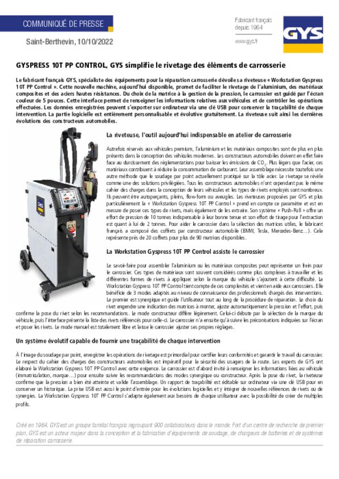 Le fabricant français GYS, spécialiste des équipements pour la réparation carrosserie dévoile sa riveteuse « Workstation Gyspress 10T PP Control ». Cette nouvelle machine, aujourd’hui disponible, promet de faciliter le rivetage de l’aluminium, des matériaux composites et des aciers hautes résistances. Du choix de la matrice à la gestion de la pression, le carrossier est guidé par l’écran couleur de 5 pouces. Cette interface permet de renseigner les informations relatives aux véhicules.