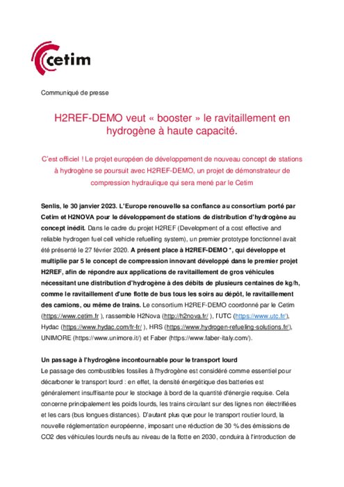 Services 30 janvier 2023 - 10:37 C’est officiel ! Le projet européen de développement de nouveau concept de stations à hydrogène se poursuit avec H2REF-DEMO, un projet de démonstrateur de compression hydraulique qui sera mené par le Cetim. PDF (163 Ko) Télécharger