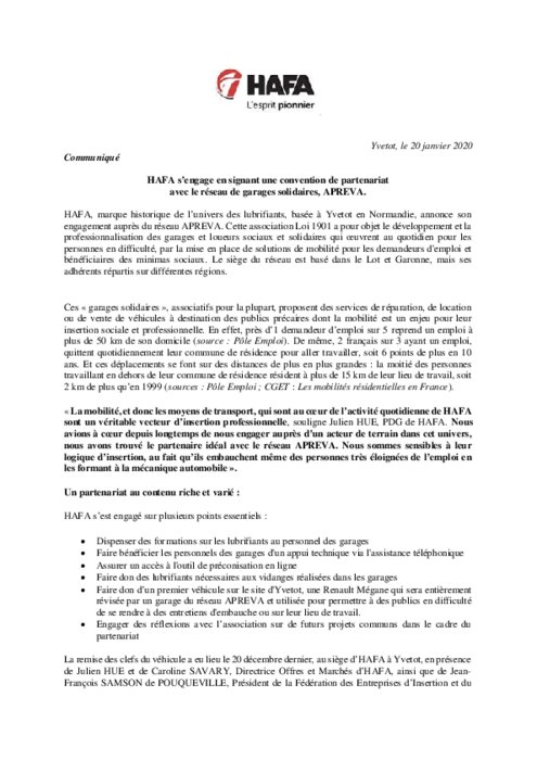 HAFA, marque historique de l'univers des lubrifiants, basée à Yvetot en Normandie, annonce son engagement auprès du réseau APREVA. Cette association Loi 1901 a pour objet le développement et la professionnalisation des garages et loueurs sociaux et solidaires qui œuvrent au quotidien pour les personnes en difficulté, par la mise en place de solutions de mobilité pour les demandeurs d'emploi et bénéficiaires des minimas sociaux. Le siège du réseau est basé dans le Lot et Garonne...