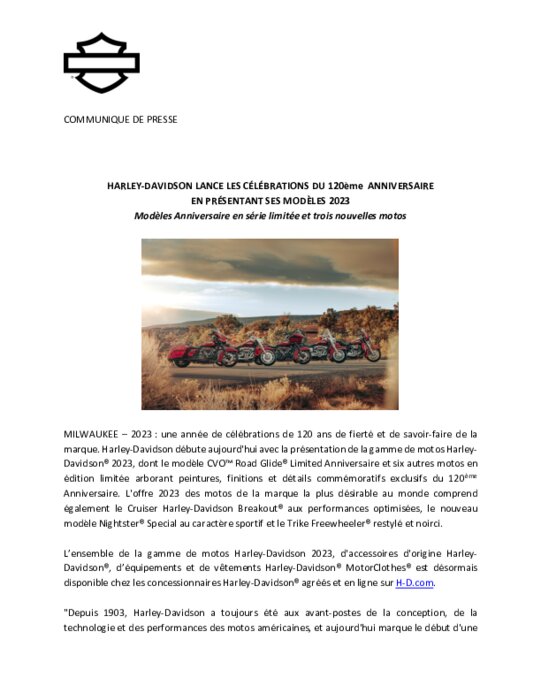 Une année de célébrations de 120 ans de fierté et de savoir-faire de la marque. Harley-Davidson débute aujourd'hui avec la présentation de la gamme de motos Harley Davidson 2023, dont le modèle CVO Road Glide Limited Anniversaire et six autres motos en édition limitée arborant peintures, finitions et détails commémoratifs exclusifs du 120ème Anniversaire.