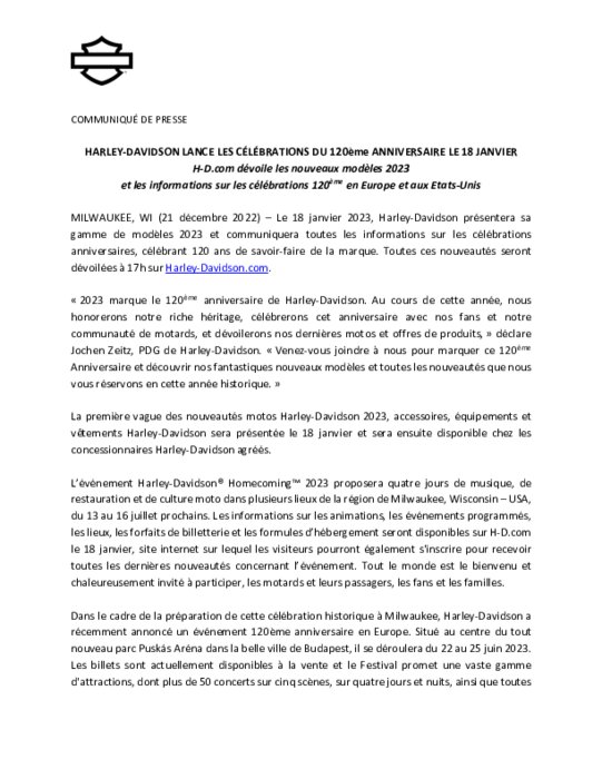Constructeurs 21 décembre 2022 - 10:01 Le 18 janvier 2023, Harley-Davidson présentera sa gamme de modèles 2023 et communiquera toutes les informations sur les célébrations anniversaires. Toutes ces nouveautés seront dévoilées à 17h sur Harley-Davidson.com PDF (155 Ko) Télécharger