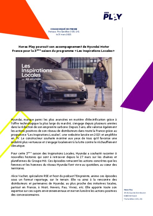 Pour cette 3ème saison des Inspirations Locales, Hyundai a souhaité raconter 6 nouvelles histoires qui sont à retrouver depuis le 27 mars sur les chaînes et plateformes du Groupe M6. Ces épisodes retracent les actions concrètes que les femmes et les hommes du réseau Hyundai font vivre au quotidien, au cœur des territoires.