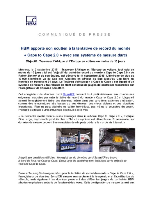 Traverser l'Afrique et l'Europe en voiture, tout cela en moins de 10 jours : tel est l'objectif du projet du record du monde « Cape to Cape 2.0 » de Rainer Zietlow et de son équipe, qui démarre le 11 septembre 2015. L'itinéraire de plus de 17 000 kilomètres va du Cap des Aiguilles en Afrique du Sud jusqu’au Cap Nord en Norvège en traversant 21 pays. Le Touareg Volkswagen « Cape to Cape » est équipé d’un système de mesure ultra-robuste de HBM...