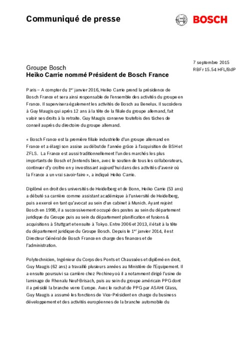 A compter du 1er janvier 2016, Heiko Carrie prend la présidence de Bosch France et sera ainsi responsable de l’ensemble des activités du groupe en France. Il supervisera également les activités de Bosch au Benelux. Il succèdera à Guy Maugis qui après 12 ans à la tête de la filiale du groupe allemand, fait valoir ses droits à la retraite. Guy Maugis conserve toutefois des tâches de conseil auprès du directoire du groupe allemand.