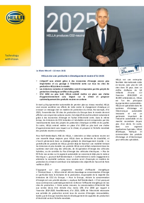 L'objectif sera atteint grâce à des économies d'énergie encore plus importantes et au passage à l'électricité verte sur tous les sites de production HELLA dans le monde. Les émissions restantes et inévitables seront compensées par des projets de protection climatique certifiés et de qualité. D'ici 2050 au plus tard, HELLA entend mettre en place une chaîne d'approvisionnement sans impact sur le climat et proposer systématiquement des produits neutres en carbone...