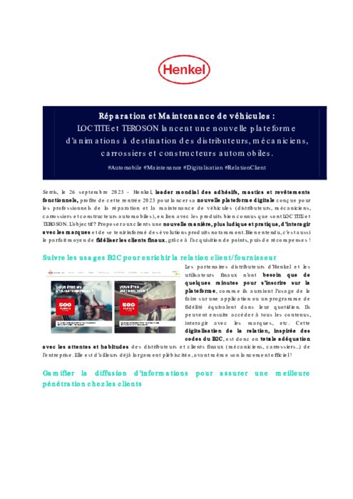 Henkel, leader mondial des adhésifs, mastics et revêtements fonctionnels, profite de cette rentrée 2023 pour lancer sa nouvelle plateforme digitale conçue pour les professionnels de la réparation et la maintenance de véhicules (distributeurs, mécaniciens, carrossiers et constructeurs automobiles), en lien avec les produits bien connus que sont LOCTITE et TEROSON.