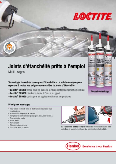 Le LOCTITE SI 5980 est un produit d'étanchéité conçu spécialement pour surfaces planes. Ce joint hautement élastique est parfaitement adapté aux applications nécessitant une bonne résistance à l'huile et une capacité à supporter de grandes déformations. Il supporte les tests à basse pression réalisés après l'assemblage des plans de joints. Sans étiquetage, le produit est à la pointe de la santé et de la sécurité.
