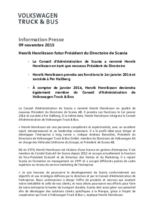 Le Conseil d’Administration de Scania a nommé Henrik Henriksson en qualité de nouveau Président du Directoire de Scania AB. Il prendra ses fonctions le 1er janvier 2016 et succède à Per Hallberg. À la même date, Henrik Henriksson intègrera le Conseil d’Administration de Volkswagen Truck & Bus. " Henrik Henriksson est une personne compétente et expérimentée, avec un excellent esprit entrepreneurial et un leadership visionnaire. Il a le profil idéal pour diriger et développer l'entreprise... "