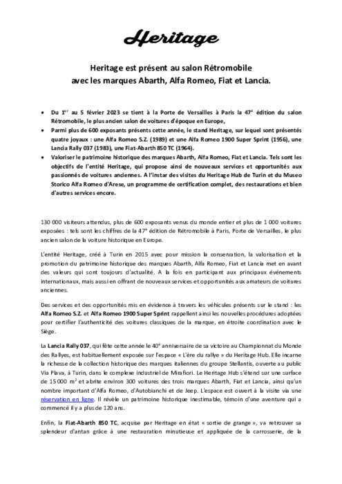 Du 1er au 5 février 2023 se tient à la Porte de Versailles à Paris la 47è édition du salon Rétromobile, le plus ancien salon de voitures d'époque en Europe. Parmi plus de 600 exposants présents cette année, le stand Heritage, sur lequel sont présentés quatre joyaux : une Alfa Romeo S.Z. (1989) et une Alfa Romeo 1900 Super Sprint (1956), une Lancia Rally 037 (1983), une Fiat-Abarth 850 TC (1964).