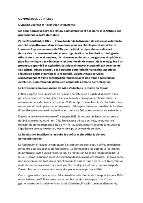Hiflow, leader de la livraison de véhicules à domicile, enrichit son offre avec deux innovations pour ses clients professionnels : la Livraison Express en moins de 24h, permettant de répondre aux aléas et demandes de dernière minute, et une organisation de Restitution Intelligente, offrant aux concessionnaires, distributeurs ou loueurs une gestion simplifiée et plus économique des véhicules à restituer en fin de contrat de leasing grâce à un processus optimisé et digitalisé.