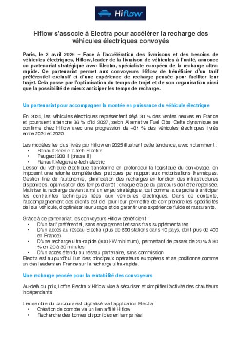 Face à l’accélération des livraisons et des besoins de véhicules électriques, Hiflow, leader de la livraison de véhicules à l’unité, annonce un partenariat stratégique avec Electra, spécialiste européen de la recharge ultra-rapide. Ce partenariat permet aux convoyeurs Hiflow de bénéficier d’un tarif préférentiel exclusif et d’une expérience de recharge pensée pour faciliter leur trajet. Cela passe par l’optimisation du temps de trajet et de son organisation ainsi que la possibilité de mieux anticiper les temps de recharge.