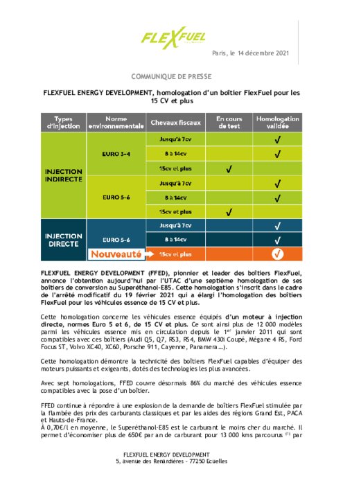 FLEXFUEL ENERGY DEVELOPMENT (FFED), pionnier et leader des boîtiers FlexFuel, annonce l’obtention aujourd’hui par l’UTAC d’une septième homologation de ses boîtiers de conversion au Superéthanol-E85. Cette homologation s’inscrit dans le cadre de l’arrêté modificatif du 19 février 2021 qui a élargi l’homologation des boîtiers FlexFuel pour les véhicules essence de 15 CV et plus.
