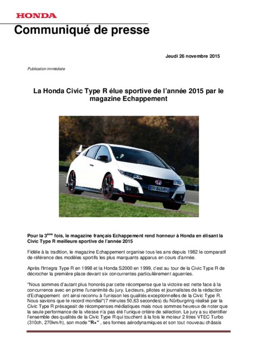 Pour la 3ème fois, le magazine français Echappement rend honneur à Honda en élisant la Civic Type R meilleure sportive de l’année 2015. Fidèle à la tradition, le magazine Echappement organise tous les ans depuis 1982 le comparatif de référence des modèles sportifs les plus marquants apparus en cours d’année.