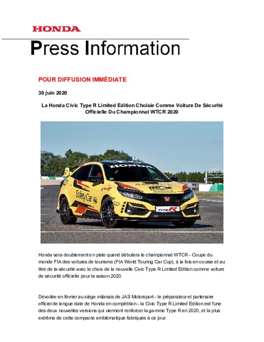 Honda sera doublement en piste quand débutera le championnat WTCR - Coupe du monde FIA des voitures de tourisme (FIA World Touring Car Cup), à la fois en course et au titre de la sécurité avec le choix de la nouvelle Civic Type R Limited Edition comme voiture de sécurité officielle pour la saison 2020.