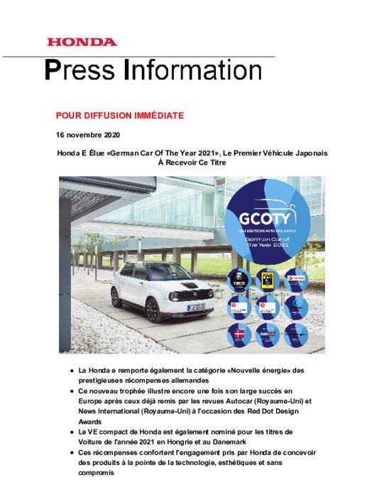 La Honda e remporte également la catégorie " Nouvelle énergie " des prestigieuses récompenses allemandes. Ce nouveau trophée illustre encore une fois son large succès en Europe après ceux déjà remis par les revues Autocar (Royaume-Uni) et News International (Royaume-Uni) à l'occasion des Red Dot Design Awards. Le VE compact de Honda est également nominé pour les titres de Voiture de l'année 2021 en Hongrie et au Danemark. Ces récompenses confortent l'engagement pris par Honda...