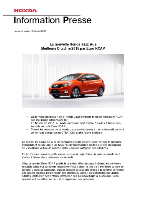 Le dernier millésime de la petite compacte Honda s'est vu décerner par l'organisme indépendant de sécurité Euro NCAP et devant 9 autres modèles le titre prestigieux de « meilleure voiture de l'année 2015 » dans la catégorie des citadines. En fin d’année dernière, cette même Jazz avait déjà obtenu la note maximale de 5 étoiles à l’issue des crash-tests de sécurité.