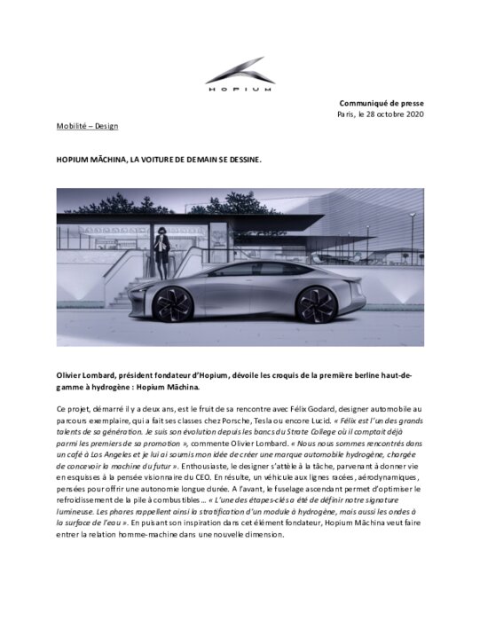 Constructeurs 28 octobre 2020 - 12:49 Olivier Lombard, président fondateur d'Hopium, dévoile les croquis de la première berline haut-de-gamme à hydrogène : Hopium Machina. PDF (480 Ko) Télécharger