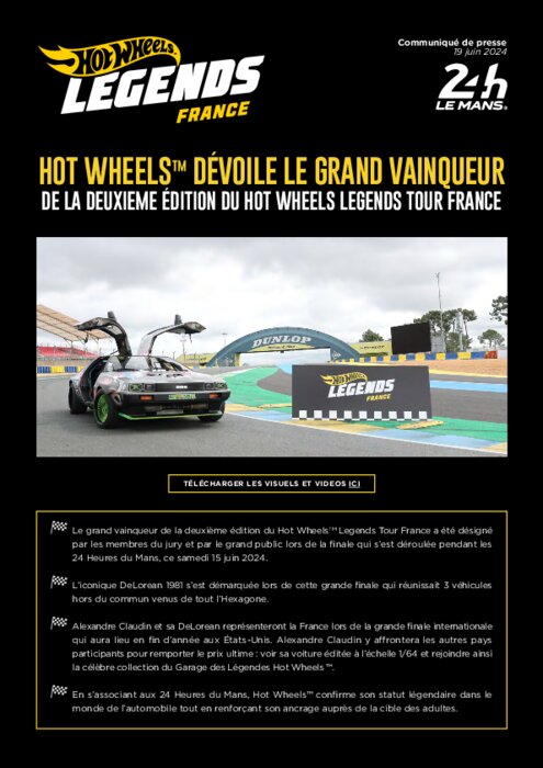 Le vainqueur du Hot Wheels Legends Tour France a été sacré lors de la finale unique qui s’est tenue en direct des mythiques 24 Heures du Mans. La DeLorean 1981 est le véhicule personnalisé français a avoir été sélectionné pour tenter de devenir la prochaine miniature Hot Wheels de Légendes lors de la grande finale internationale, qui réunira les vainqueurs de tous les pays participants.
