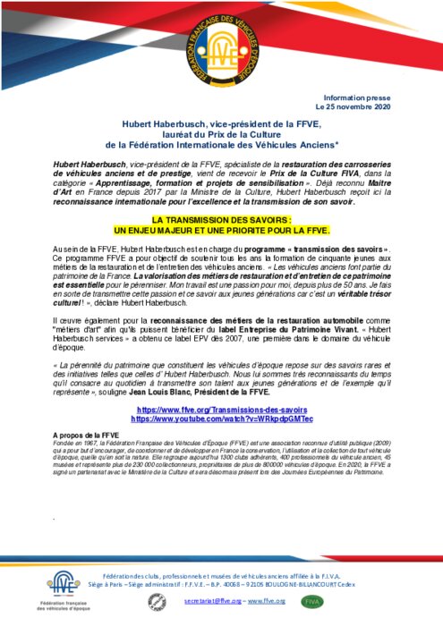 Hubert Haberbusch, vice-président de la FFVE, spécialiste de la restauration des carrosseries de véhicules anciens et de prestige, vient de recevoir le Prix de la Culture FIVA, dans la catégorie " Apprentissage, formation et projets de sensibilisation ". Déjà reconnu Maitre d’Art en France depuis 2017 par la Ministre de la Culture, Hubert Haberbusch reçoit ici la reconnaissance internationale pour l’excellence et la transmission de son savoir.