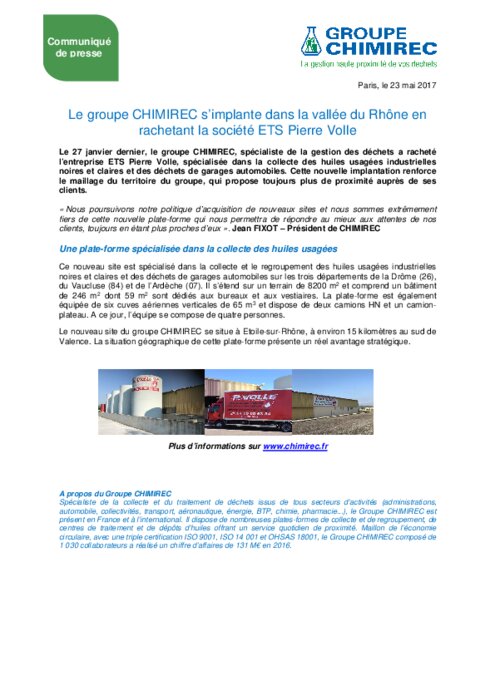 Le 27 janvier dernier, le groupe CHIMIREC, spécialiste de la gestion des déchets a racheté l’entreprise ETS Pierre Volle, spécialisée dans la collecte des huiles usagées industrielles noires et claires et des déchets de garages automobiles. Cette nouvelle implantation renforce le maillage du territoire du groupe, qui propose toujours plus de proximité auprès de ses clients.