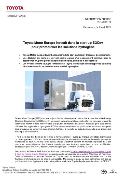 Toyota Motor Europe annonce sa prise de participation directe dans la société EODev. En renforçant son partenariat avec cette start-up française innovante, l’entreprise montre qu’elle fait confiance aux jeunes entreprises flexibles et réactives pour accélérer la diffusion des applications hydrogène. EODev et ses partenaires se positionnent en acteur européen majeur capable de concevoir, assembler et distribuer à l’échelle industrielle des solutions de production électrique zéro émission.