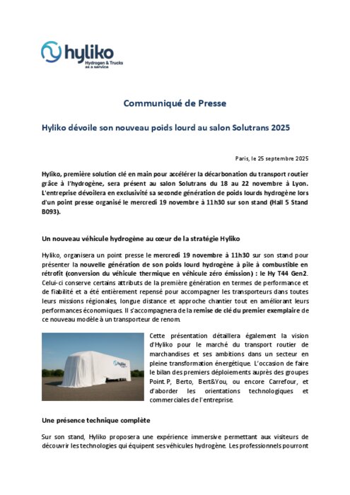 Constructeurs 25 septembre 2025 - 16:06 Hyliko est une startup française qui propose la première solution clé en main pour accélérer la décarbonation du transport routier grâce à l'hydrogène. C'est le premier acteur en France à avoir mis en exploitation des poids lourds hydrogène. PDF (347 Ko) Télécharger credit Hylico