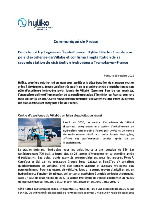 Hyliko, première solution clé en main pour accélérer la décarbonation du transport routier grâce à l'hydrogène, dresse un bilan très positif de la première année d’exploitation de son pôle d’excellence hydrogène poids lourds de Villabé (Essonne). Fort de ces résultats, l’entreprise confirme l’implantation de sa deuxième station à Tremblay-en-France, pour une mise en service en 2027. Cette nouvelle étape renforce l’écosystème Grand ParHY au service des transporteurs et chargeurs d’Île-de-France.