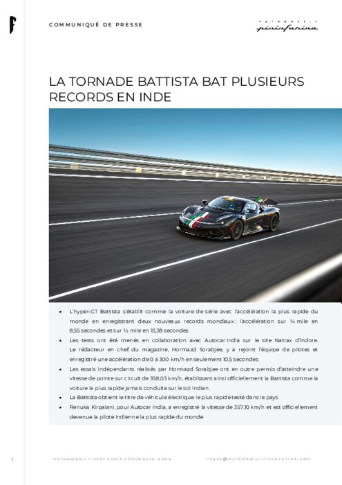 L'hyper-GT Battista s'établit comme la voiture de série avec l'accélération la plus rapide du monde en enregistrant deux nouveaux records mondiaux : l'accélération sur ¼ mile en 8,55 secondes et sur ½ mile en 13,38 secondes. Les tests ont été menés en collaboration avec Autocar India sur le site Natrax d'Indore.Le rédacteur en chef du magazine, Hormazd Sorabjee, y a rejoint l'équipe de pilotes et enregistré une accélération de 0 à 300 km/h en seulement 10,5 secondes.