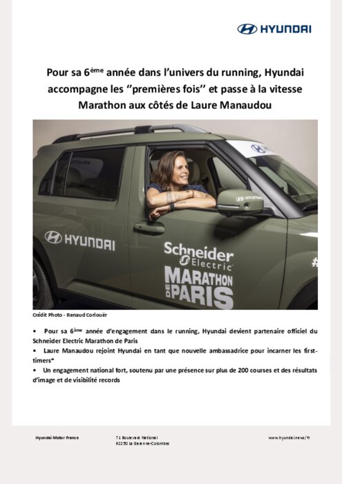 Hyundai Motor France annonce son partenariat avec le Schneider Electric Marathon de Paris, l’un des plus grands événements running au monde, renforçant ainsi son engagement en faveur du sport, de la mobilité et du dépassement de soi.
