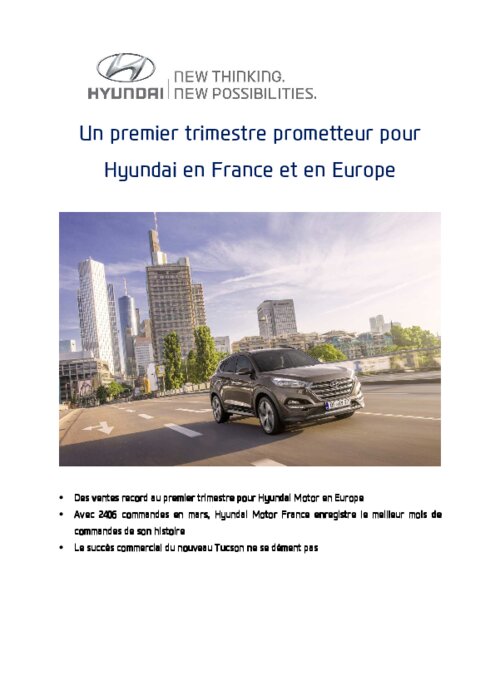Selon les dernières données publiées par l’Association des constructeurs européens d’automobiles (ACEA), les immatriculations de véhicules Hyundai en Europe ont atteint de nouveaux sommets au premier trimestre 2016. Avec 126 519 immatriculations dans la région, l’entreprise a enregistré une hausse de 5,5 % sur la zone par rapport à la même période de 2015, qui s'inscrivait alors comme le meilleur trimestre de son histoire.