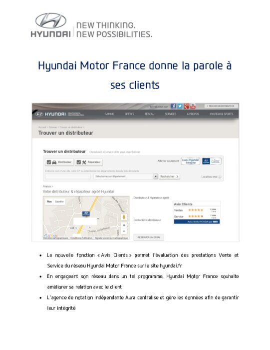 La nouvelle fonction " Avis Clients " permet l’évaluation des prestations Vente et Service du réseau Hyundai sur le site hyundai.fr. En engageant son réseau dans un tel programme, Hyundai France souhaite améliorer sa relation avec le client. L’agence de notation indépendante Aura centralise et gère les données afin de garantir leur intégrité.
