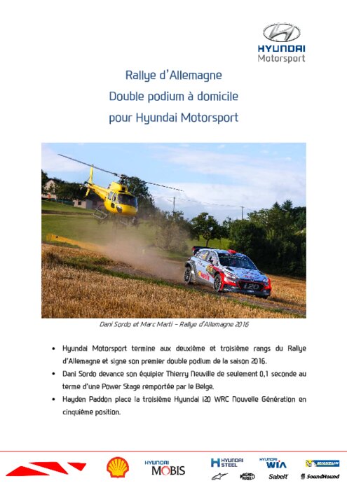 Constructeurs 22 août 2016 - 11:46 Hyundai Motorsport place deux équipages sur le podium du Rallye d’Allemagne, avec Dani Sordo et Thierry Neuville aux deuxième et troisième positions finales de la neuvième manche du Championnat du Monde des Rallyes FIA (WRC). PDF (367 Ko) Télécharger