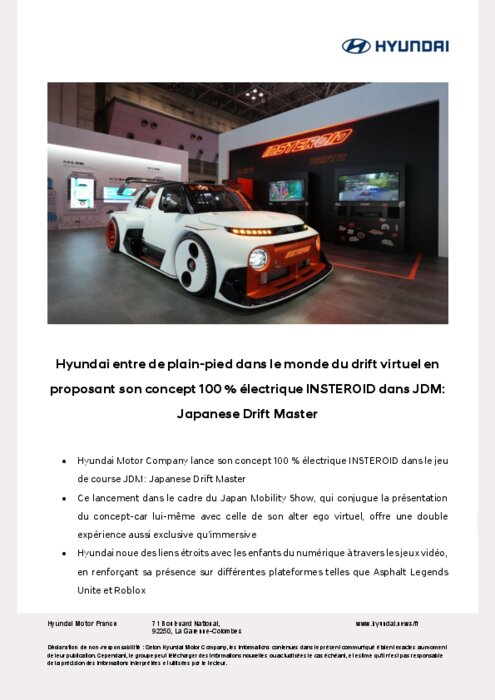 Constructeurs 07 novembre 2025 - 16:21 Hyundai Motor Company lance son concept-car électrique révolutionnaire INSTEROID dans le jeu de drift JDM : Japanese Drift Master, redéfinissant ainsi les frontières entre mobilité et culture du gaming. PDF (355 Ko) Télécharger