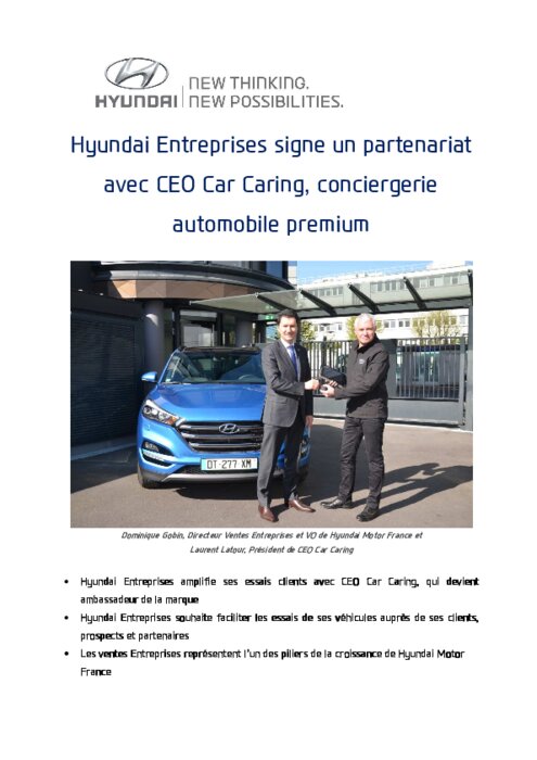 Hyundai Entreprises étoffe son service client et prospect en s’associant avec l’entreprise de conciergerie automobile premium CEO Car Caring. Si les essais automobiles sont indispensables dans la prospection de nouveaux clients Entreprises, leur réalisation dans les meilleures conditions (choix des modèles, nombre et disponibilité) en font un atout majeur de transformation. Ils permettent également d’augmenter la notoriété vis-à-vis des acteurs du marché Entreprises.