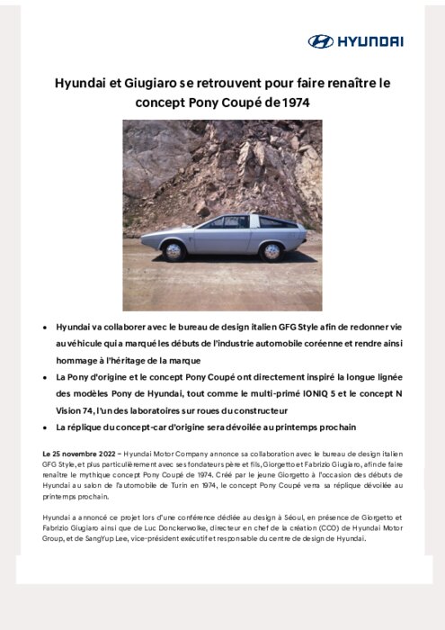 Hyundai collaborera avec le bureau de design italien GFG Style afin de redonner vie au véhicule qui a marqué les débuts de l’industrie automobile coréenne et rendre ainsi hommage à l’héritage de la marque. La Pony d'origine et le concept Pony Coupé ont directement inspiré la longue lignée des modèles Pony de Hyundai, tout comme le multi-primé IONIQ 5 et le concept N Vision 74, l’un des laboratoires sur roues du constructeur.