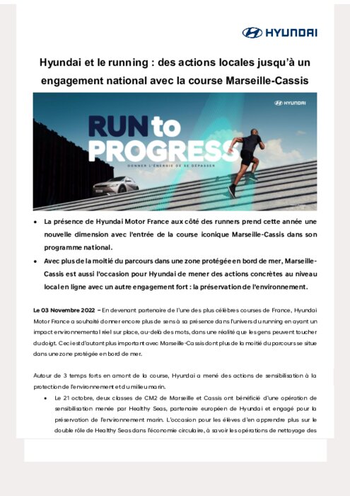 La présence de Hyundai Motor France aux côté des runners prend cette année une nouvelle dimension avec l’entrée de la course iconique Marseille-Cassis dans son programme national. Avec plus de la moitié du parcours dans une zone protégée en bord de mer, Marseille Cassis est aussi l’occasion pour Hyundai de mener des actions concrètes au niveau local en ligne avec un autre engagement fort : la préservation de l’environnement.