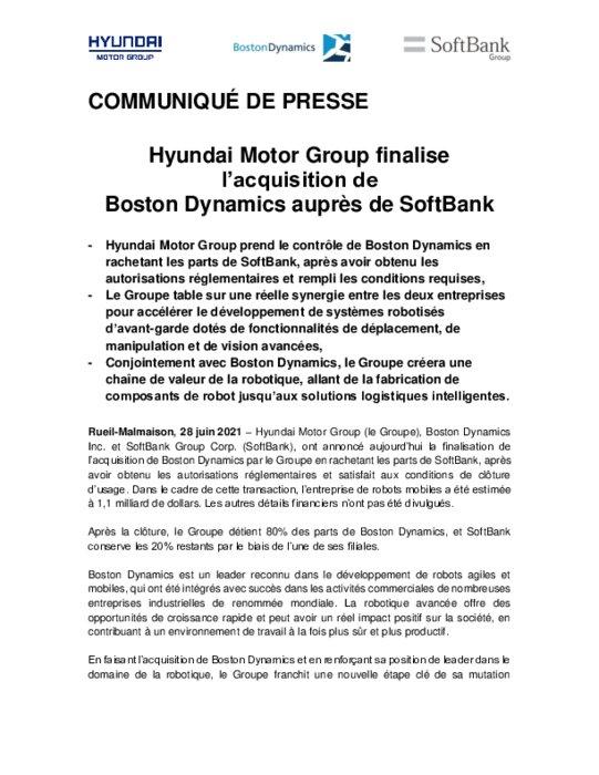 Hyundai Motor Group, Boston Dynamics et SoftBank, ont annoncé la finalisation de l’acquisition de Boston Dynamics par le Groupe en rachetant les parts de SoftBank, après avoir obtenu les autorisations réglementaires et satisfait aux conditions de clôture d’usage. Dans le cadre de cette transaction, l’entreprise de robots mobiles a été estimée à 1,1 milliard de dollars...