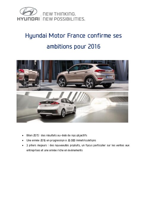 Après une année 2014 contrastée, Hyundai France progresse et dépasse ses objectifs en 2015 pour se montrer toujours plus ambitieux en 2016. En Europe, les ventes 2015 ont atteint le chiffre record de 470 130 immatriculations soit 3.3% de part de marché. Parmi les marchés européens, Hyundai France affiche la meilleure progression sur l’année 2015 (+39.6%) devant l’Espagne et l’Italie. Le marché français a en effet enregistré 23 968 immatriculations et 1,25% de part de marché.