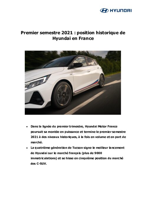 Avec 23 039 immatriculations en 6 mois (+ 52 %), Hyundai se montre à nouveau en avance sur le marché (+ 28.9%). Un tel volume n'a jamais été atteint par Hyundai en France, le précédent record datant de 2019 avec un peu moins de 20 000 unités à fin juin. Encore plus impactant que le volume, la part de marché de Hyundai progresse pour atteindre un niveau historique de 2.5 % sur les six premiers mois de 2021...