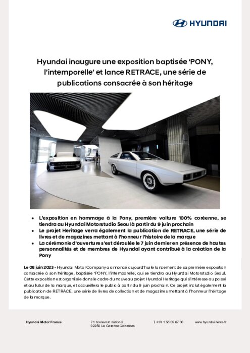 Constructeurs 08 juin 2023 - 15:44 Hyundai Motor Company a annoncé aujourd’hui le lancement de sa première exposition consacrée à son héritage, baptisée "PONY, l’intemporelle", qui se tiendra au Hyundai Motorstudio Seoul à partir du 09 juin prochain. PDF (472 Ko) Télécharger