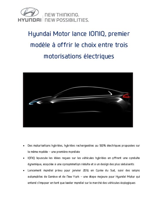 Hyundai Motor a dévoilé le nom de son modèle compact fonctionnant avec des carburants alternatifs, dont le lancement est prévu en 2016 : il sera baptisé " Hyundai IONIQ ". Ce véhicule sera équipé au choix d'une motorisation hybride, hybride rechargeable ou 100% électrique. Hyundai devient ainsi le premier constructeur à proposer un seul et même modèle avec ces trois types de motorisation.