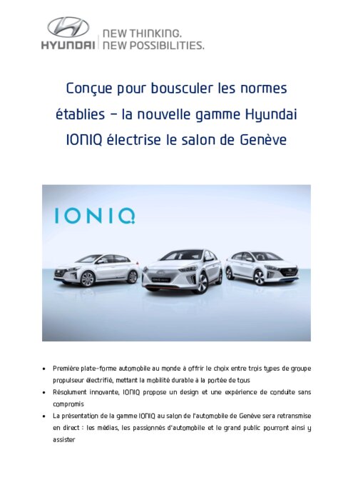 Au salon de l'automobile de Genève 2016, Hyundai présente sa toute nouvelle gamme IONIQ, composée de : IONIQ Hybride, IONIQ Électrique et IONIQ Hybride Rechargeable. Premier modèle au monde offrant trois types de groupe propulseur électrifié sous une même carrosserie, IONIQ mettra la mobilité durable à la portée de tous.